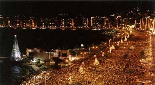 – Praia de Copacabana: ver a queima de fogos a beira-mar é tradição brasileira, milhares de pessoas se direcionam a toda a extensão litorânea do pais, para pular as sete ondinhas, dedicar oferendas a Iemanjá, fazer suas simpatias, curtir shows e entrar começar de novo, com novas amizades e quem sabe amores. Sem dúvida a praia mais procurada e disputada do país é Copacabana, onde a beleza natural do ambiente se mistura ao mar de vestes brancas, tradição brasílica. Nesta mesma linha destaca-se também a Avenida Paulista em São Paulo, as praias de Fortaleza e a Avenida Beira Mar em Florianópolis.